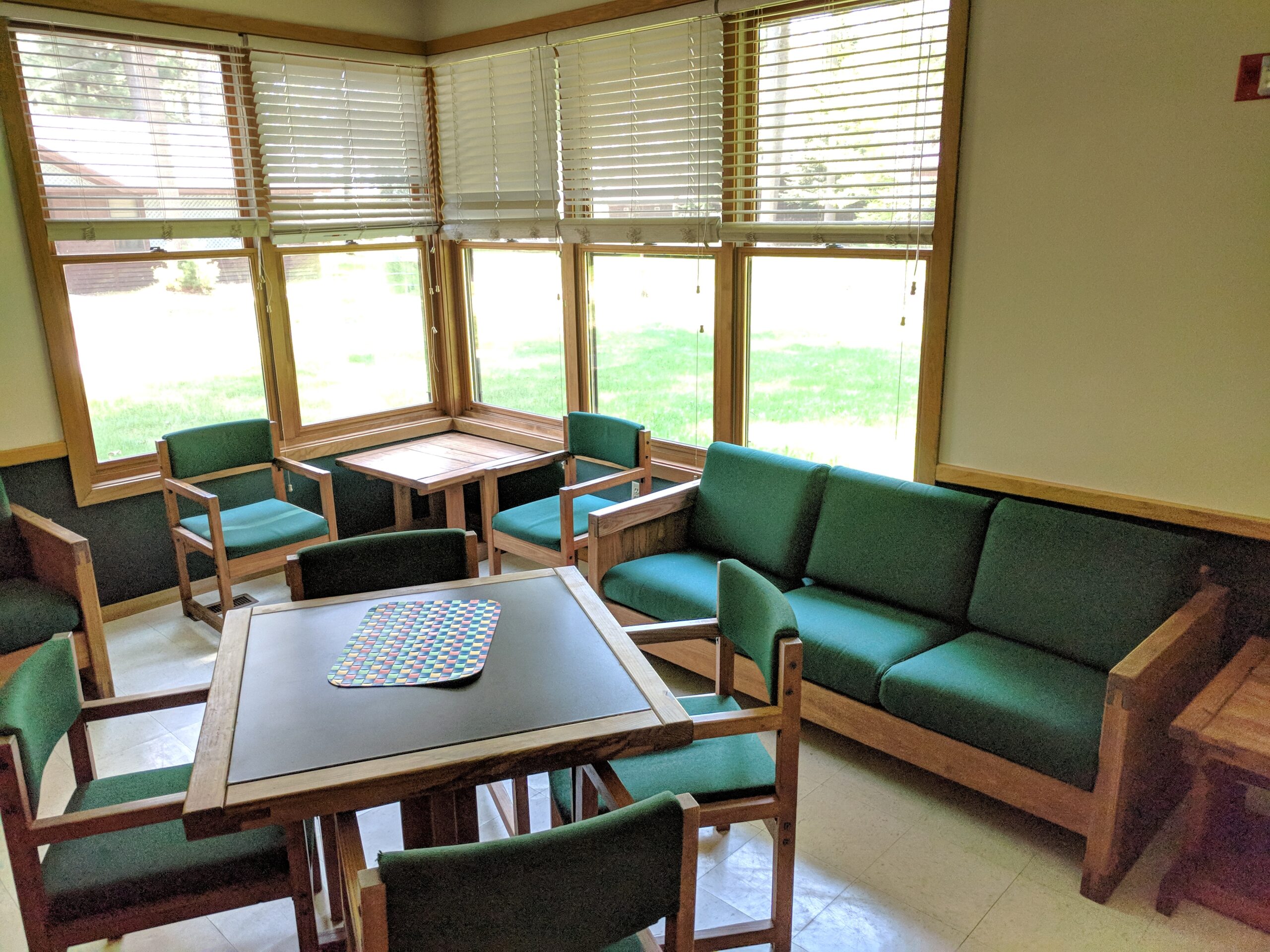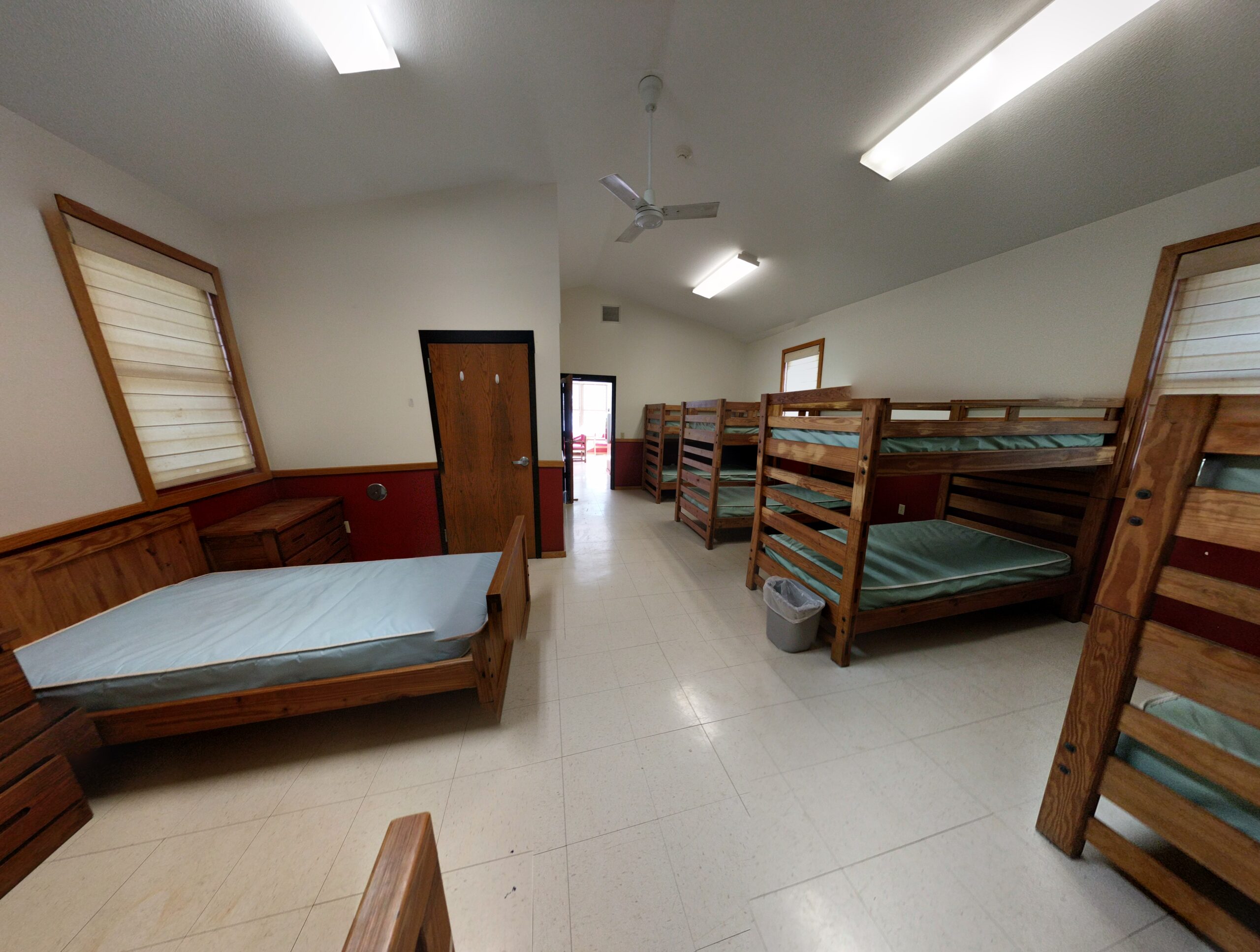 Each duplex cabin sleep 20 people, with 10 on each side. Each side has its own full bathroom, and a shared lounge area in-between with a microwave, table, couches, coffee maker, and mini-fridge. Cabins are great to stay in with your family, and those nimble enough to sleep on a top bunk!